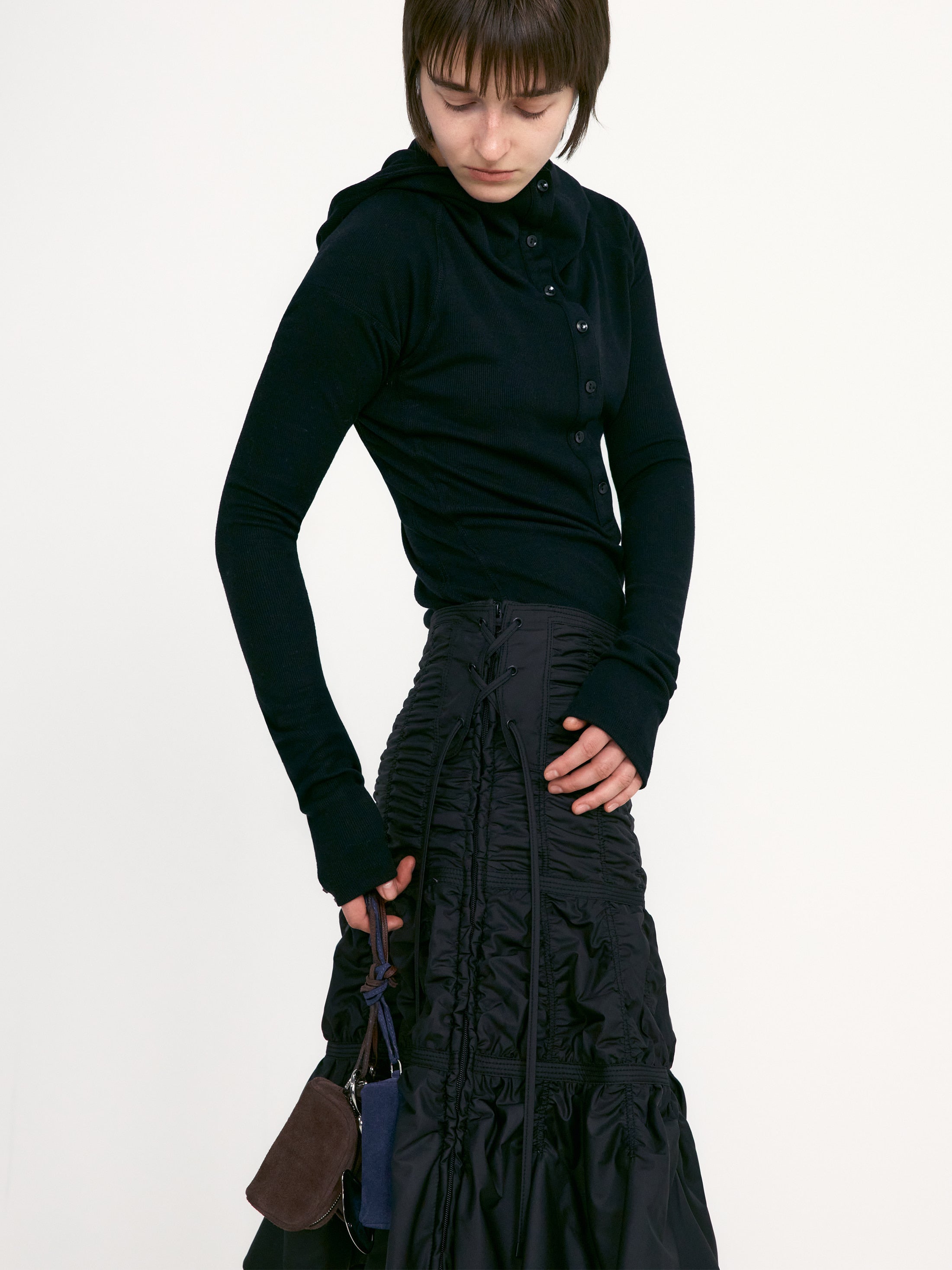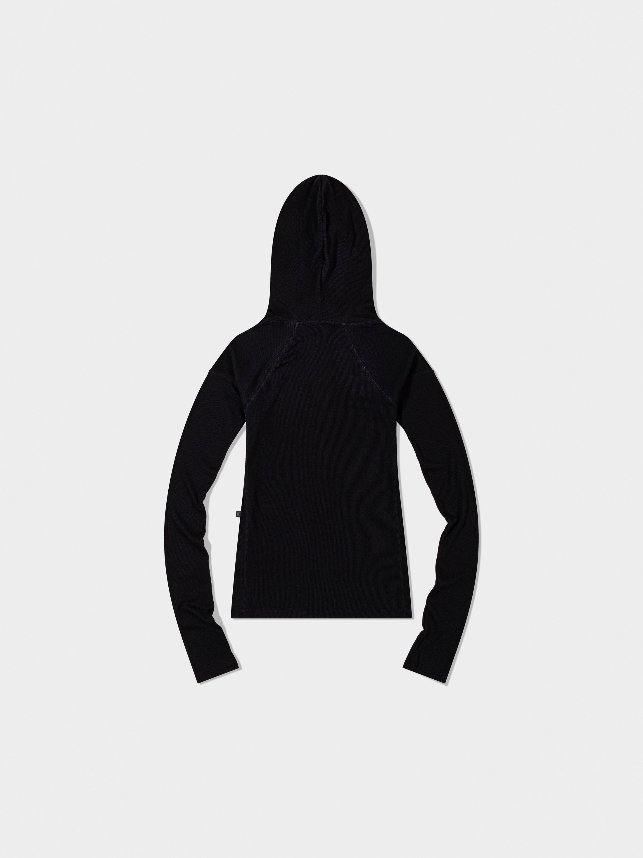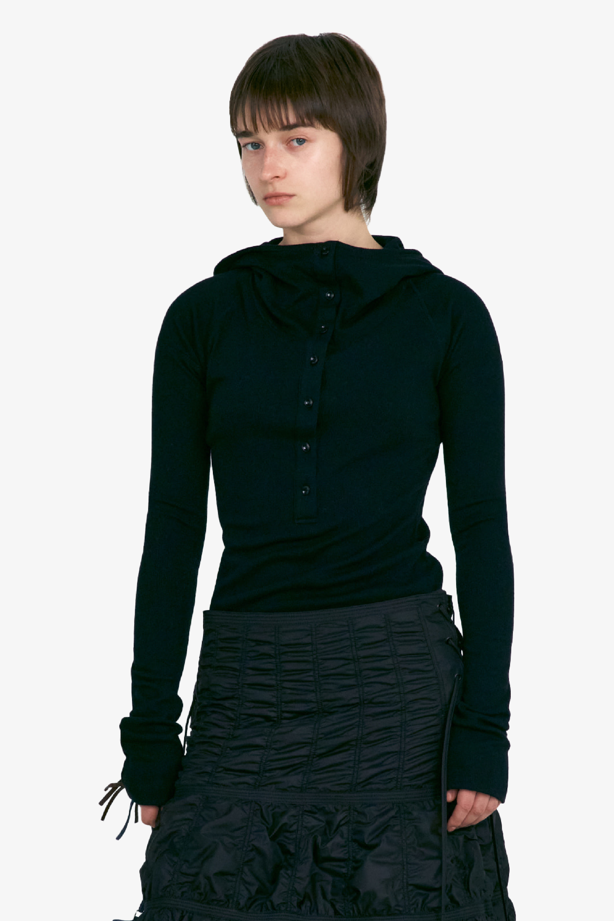 這款連帽上衣以柔軟親膚的羅紋面料製成,穿著舒適貼合。胸前延伸至領口的鈕扣細節增添造型變化,可依喜好全扣呈現高領效果。無論單穿或作為內搭,都能輕鬆展現層次;偏長的袖型設計既帶來個性感,也營造修長的手臂視覺比例。