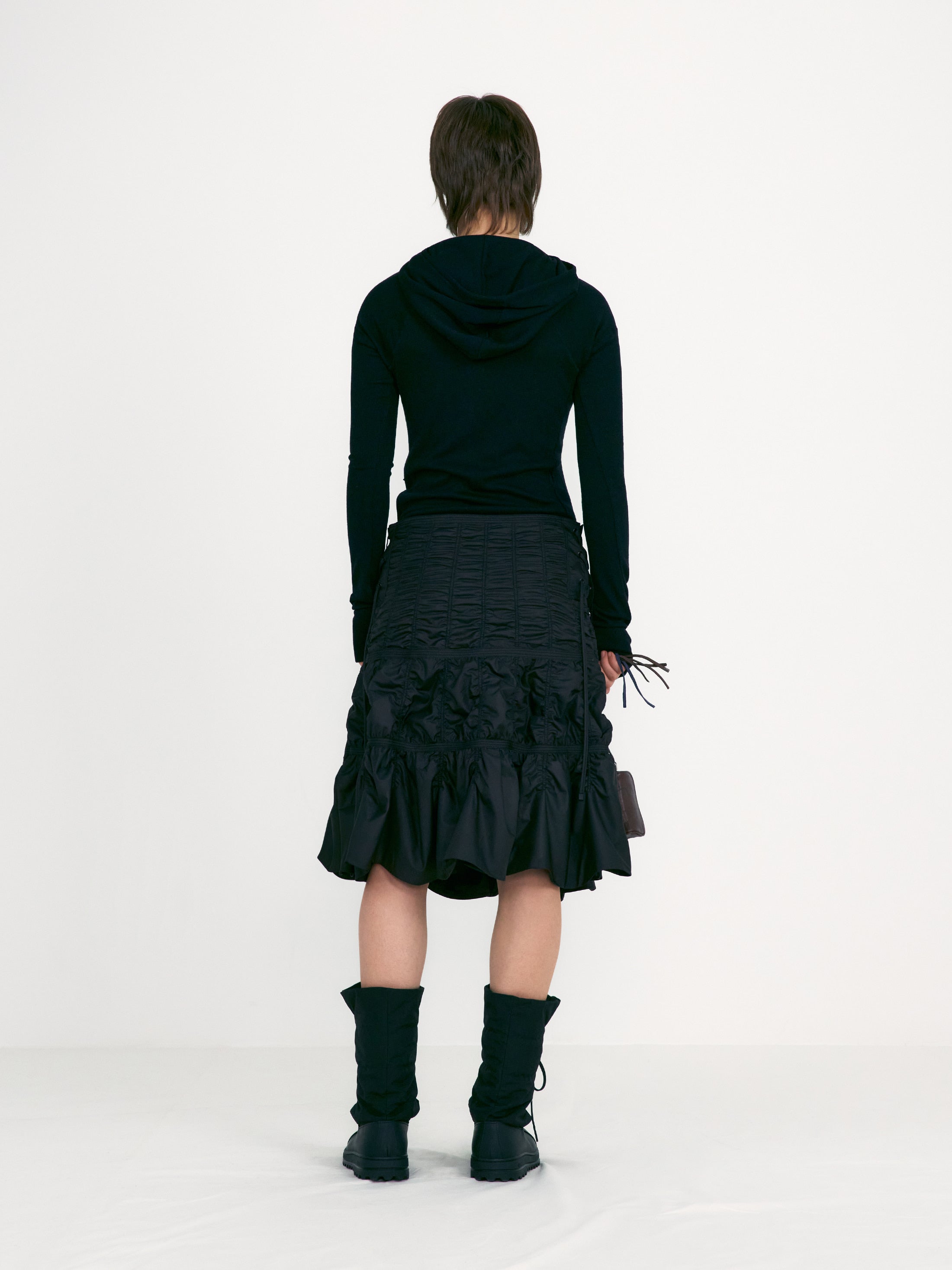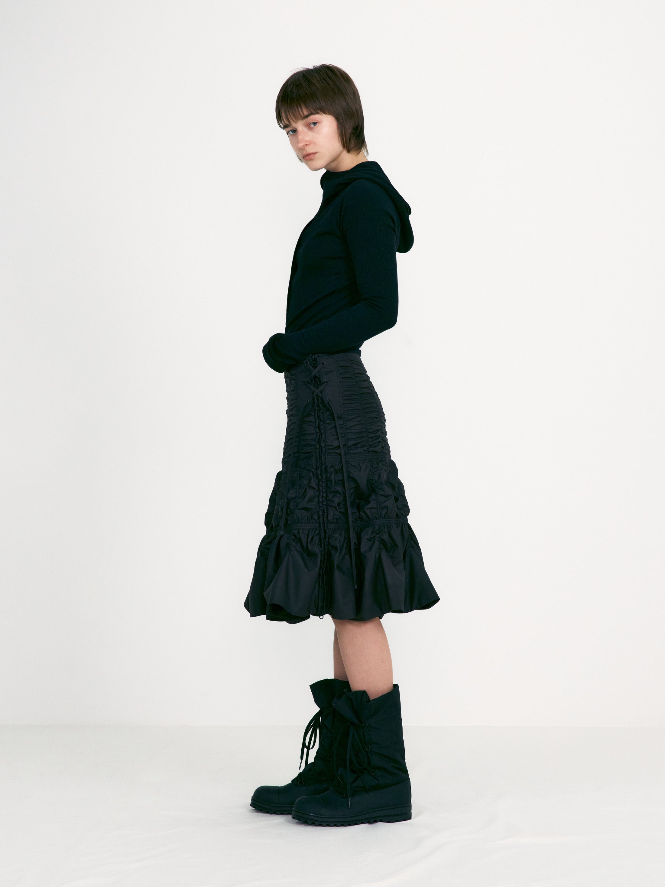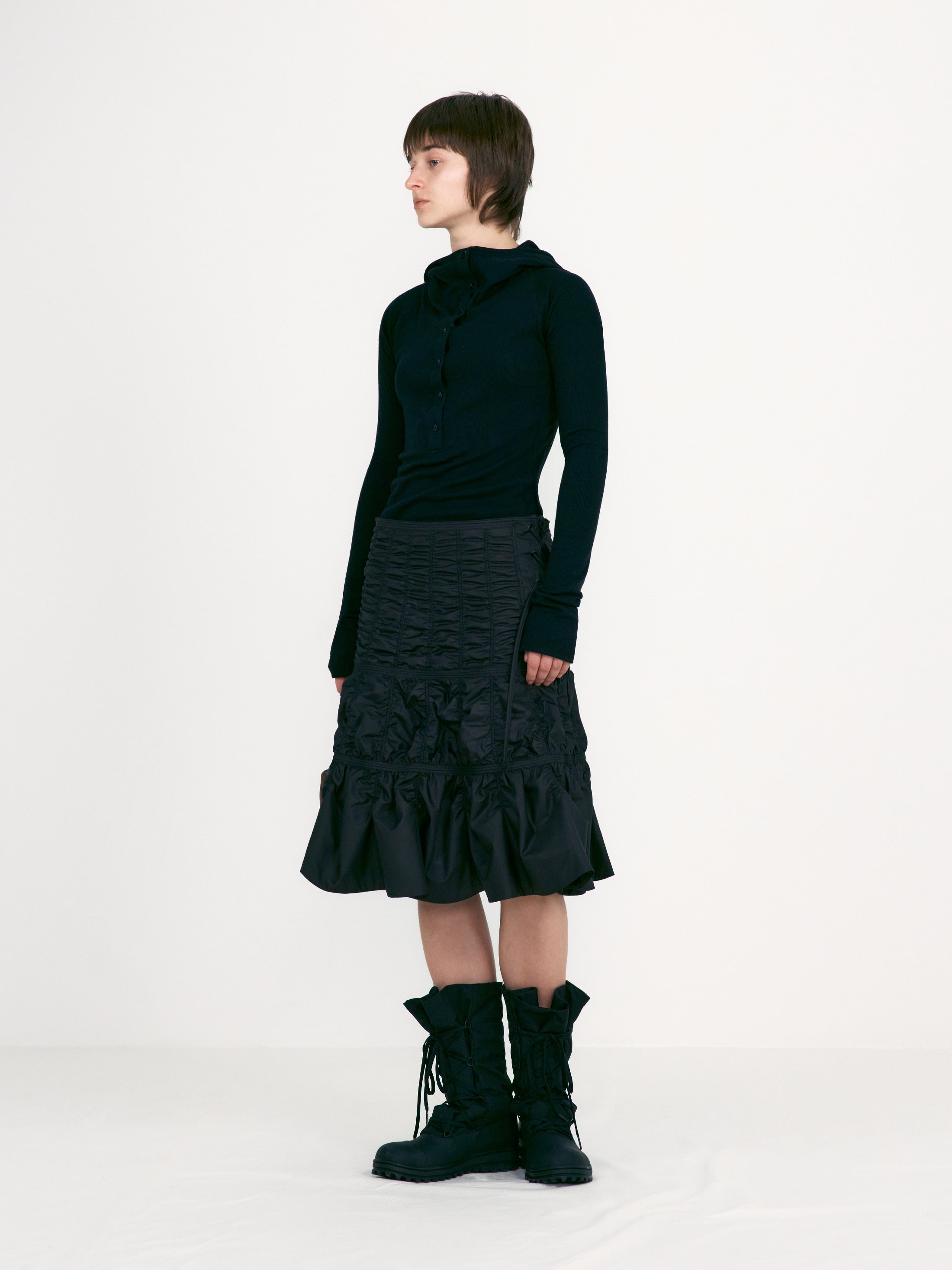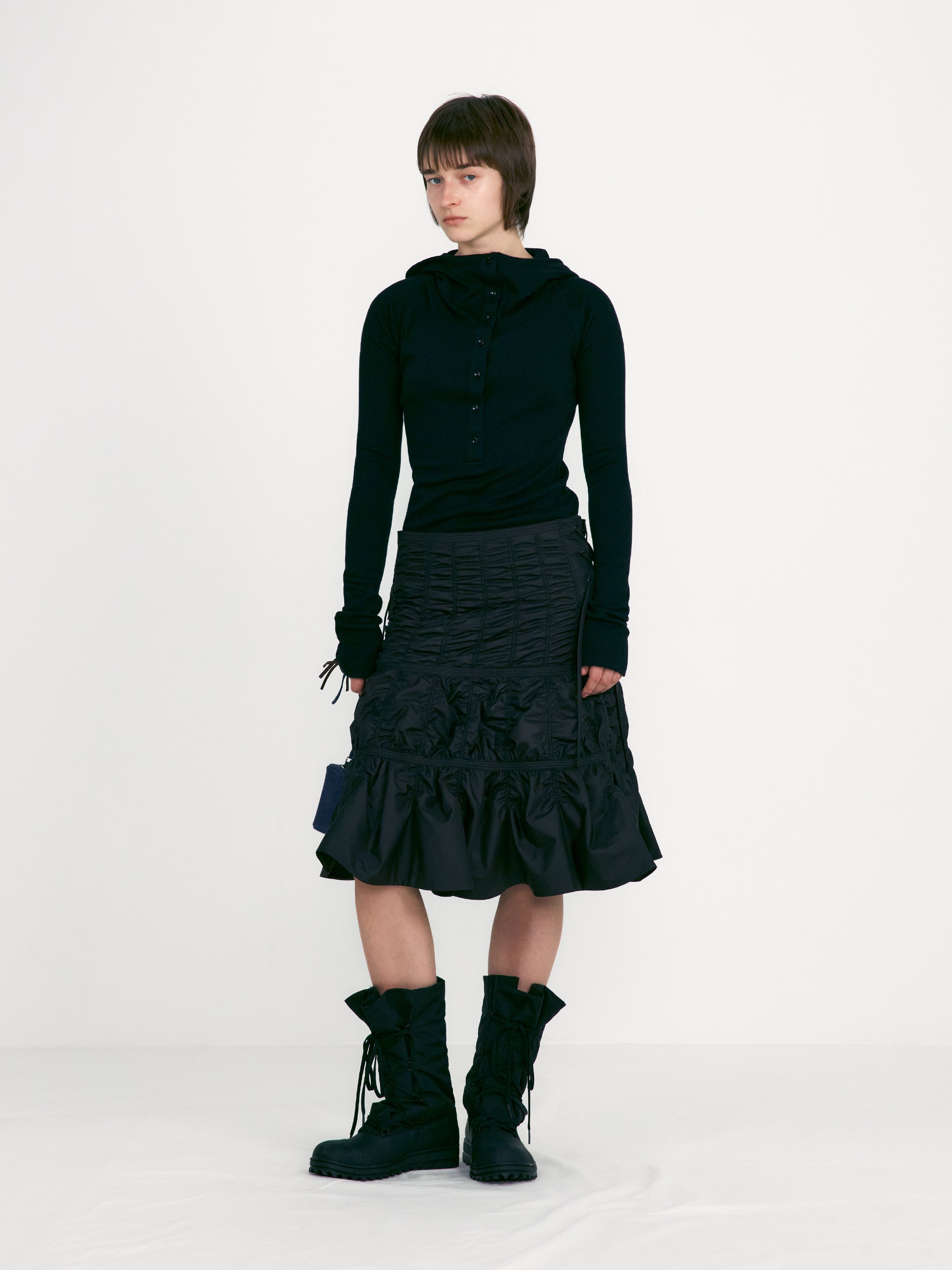 這款連帽上衣以柔軟親膚的羅紋面料製成,穿著舒適貼合。胸前延伸至領口的鈕扣細節增添造型變化,可依喜好全扣呈現高領效果。無論單穿或作為內搭,都能輕鬆展現層次;偏長的袖型設計既帶來個性感,也營造修長的手臂視覺比例。