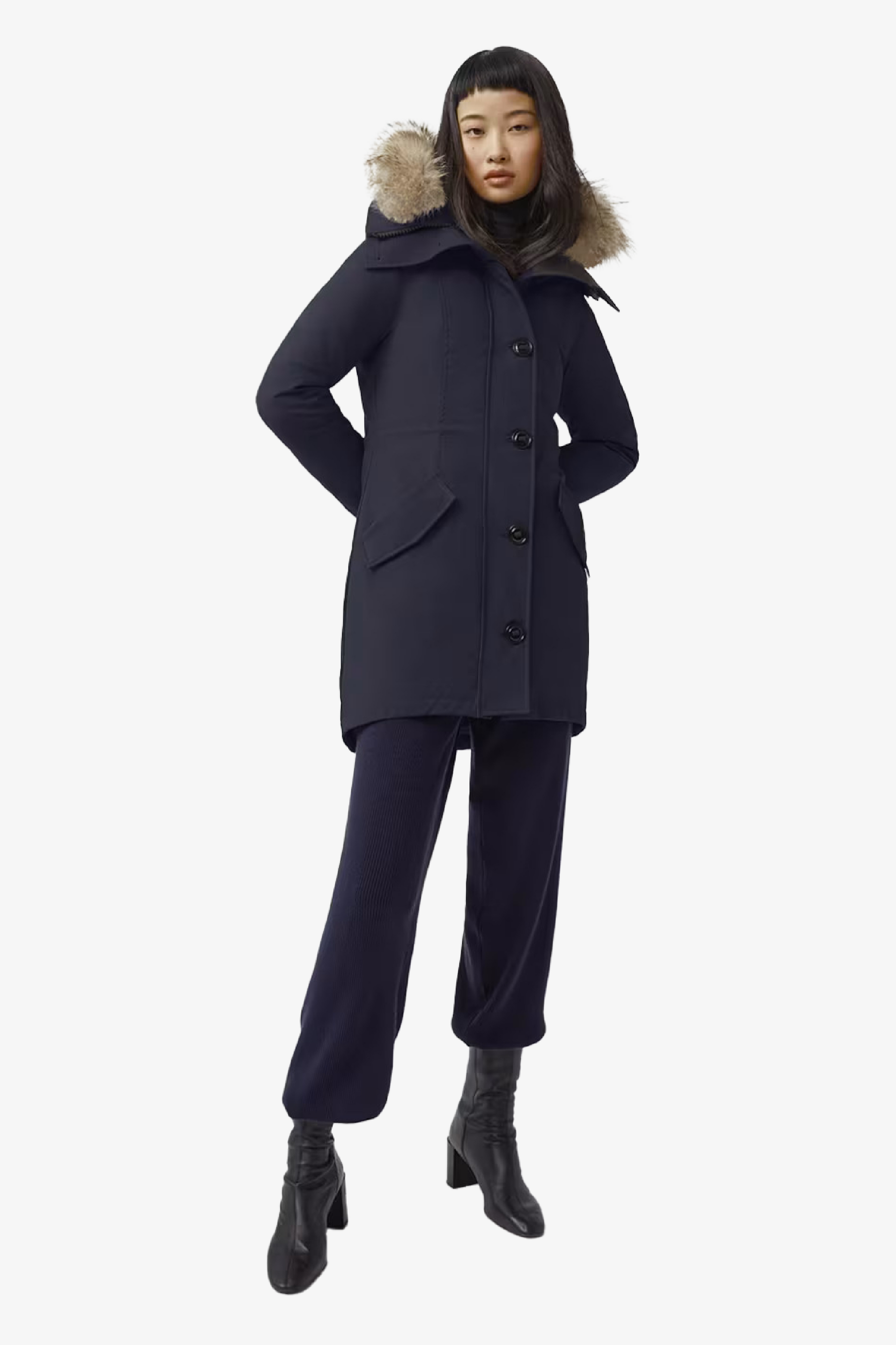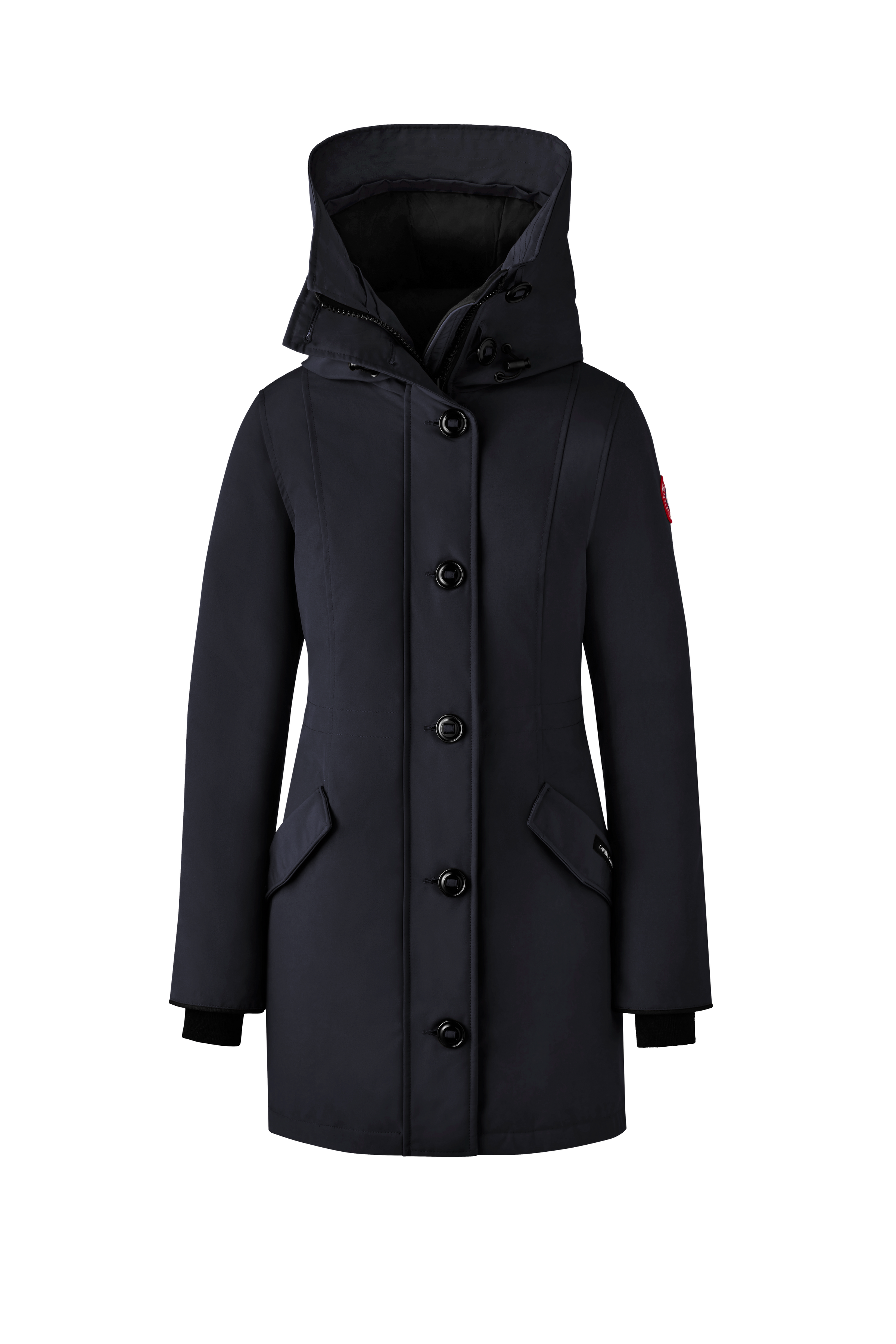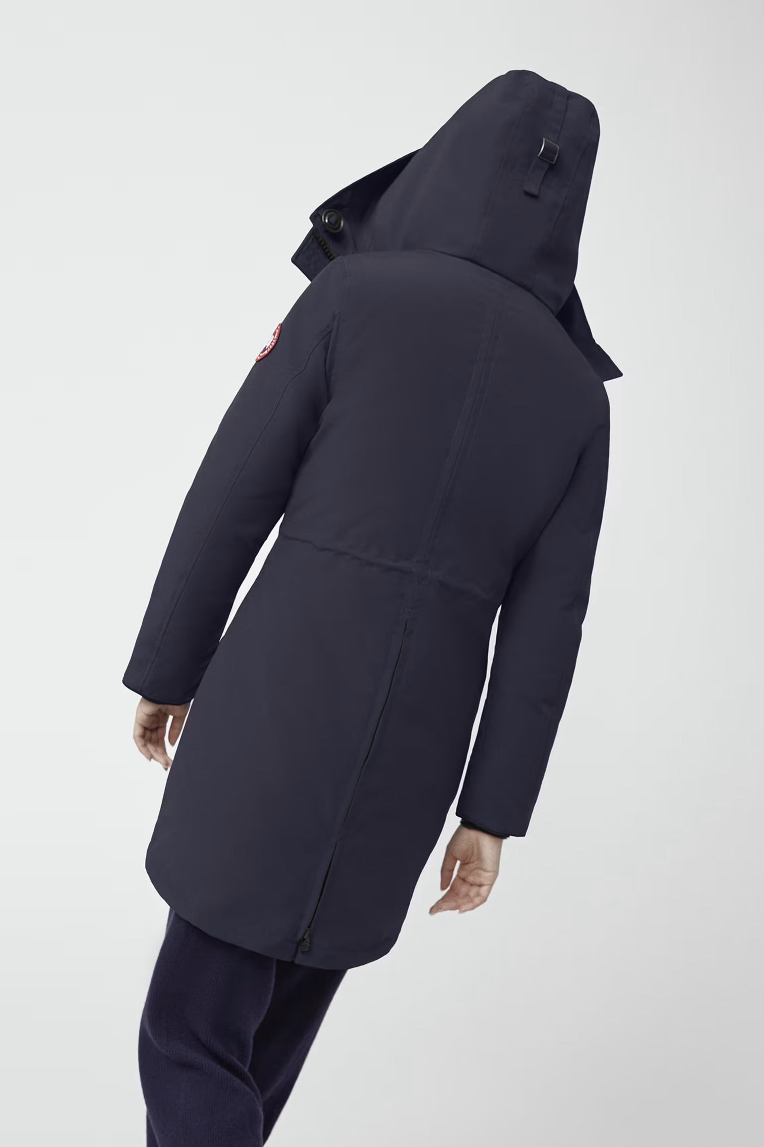 Rossclair 羽絨大衣為 Canada Goose 經典原創設計款之一,俐落剪裁呈現簡約線條,腰身為可調式設計,依照造型塑造優雅的 A 字輪廓,同時有效阻擋冷風侵入。背部設有拉鍊,可調整開衩,提升活動度,搭配加長下擺進一步提升對寒風與低溫的防護效果。