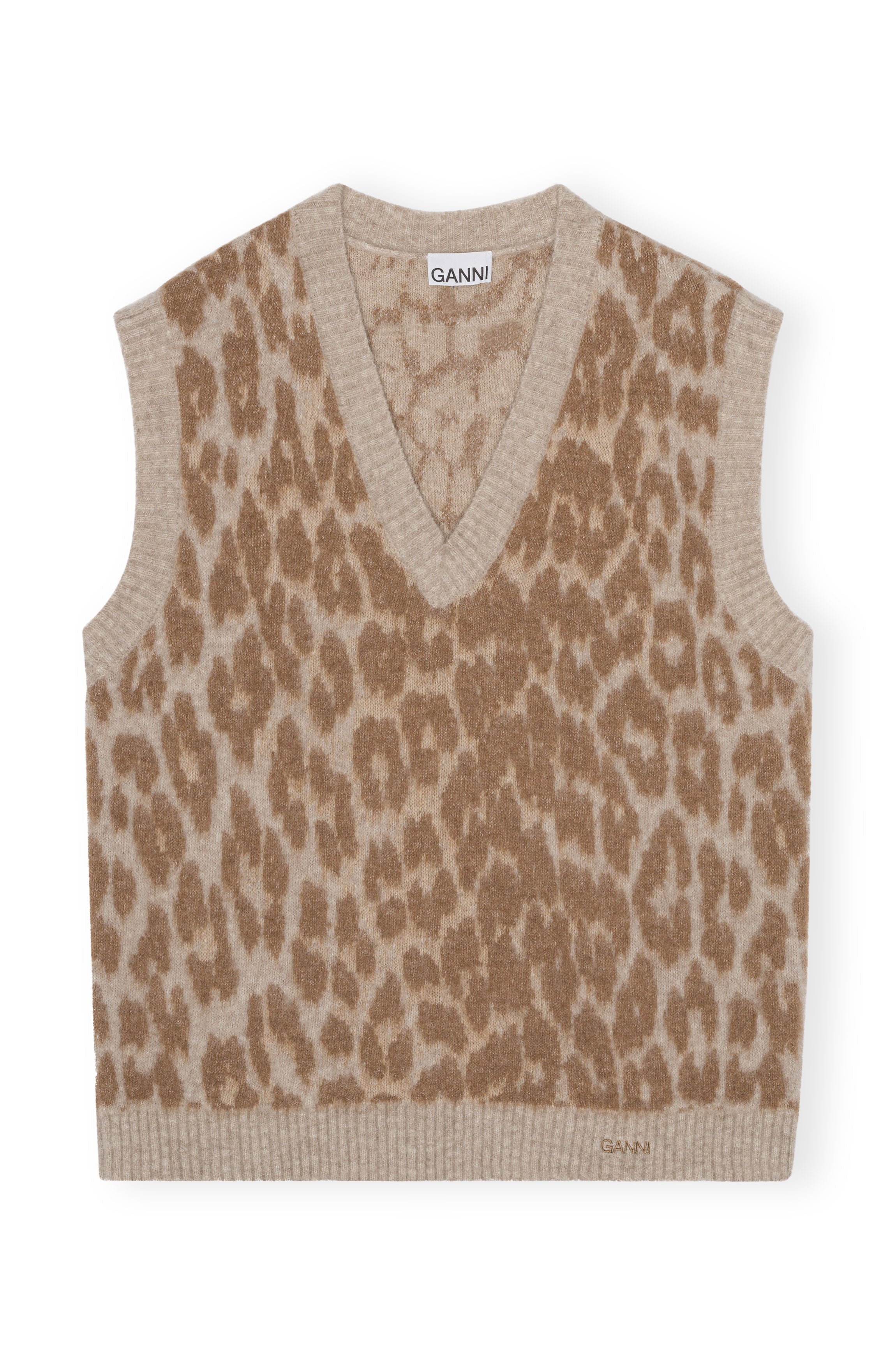 來自丹麥的 GANNI 以活潑趣味的服裝出名。豹紋針織背心以柔軟的羊駝毛與羊毛混紡製成,以品牌標誌性的豹紋圖案呈現溫暖的米棕色調,並在下擺織有低調品牌字樣。大 V 領剪裁設計增添修飾效果,可搭配襯衫或高領上衣打造秋冬層次造型。